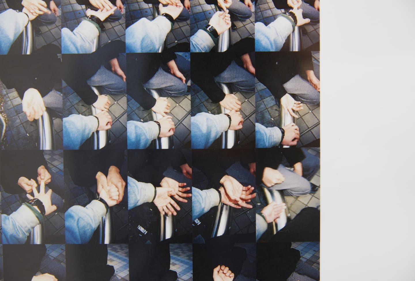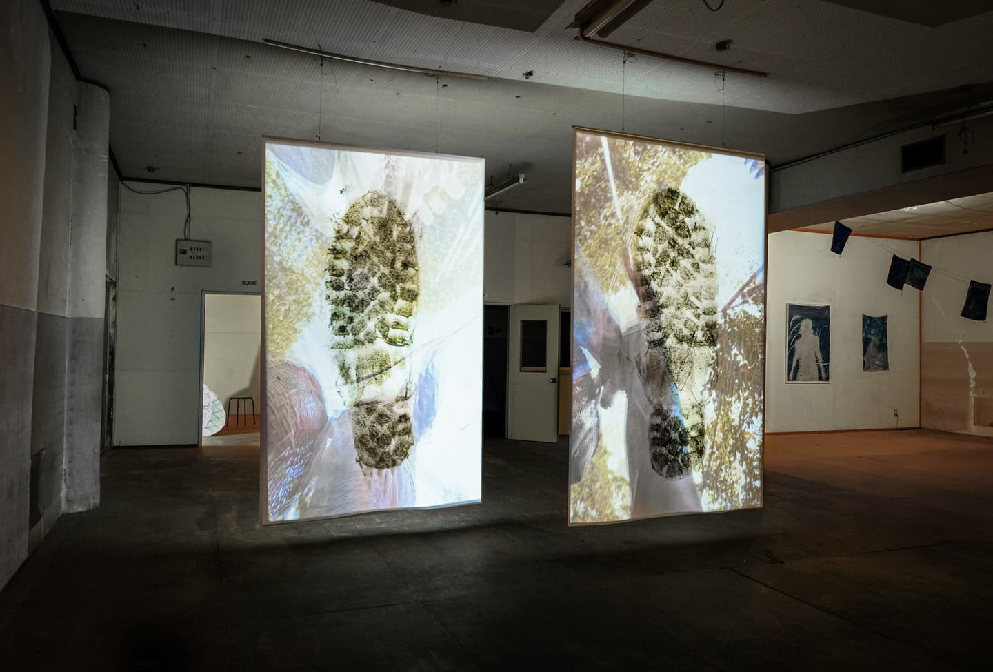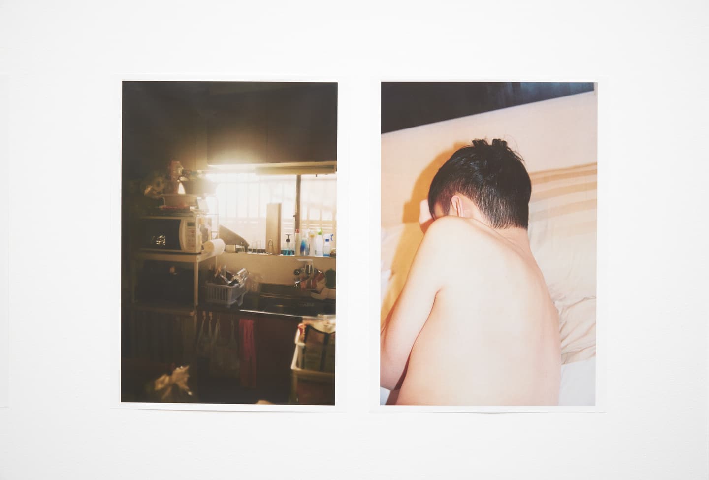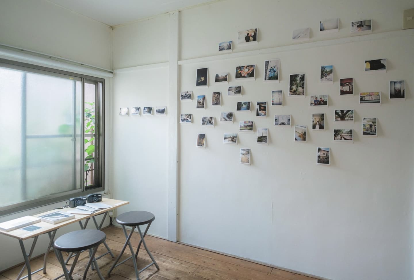写真作品《in your eyes》では、私とジャスティンがそれぞれにそれぞれの生まれ年のフィルムカメラを持って旅を撮影し、お互いの写真が混ざり合って置かれている。2020年の展覧会では、会場にプリンターを持ち込み、私自身がその場で写真をプリントしながら来場者が一人一枚持ち帰れる形であったが、展示を観てくれていた友人のアーティスト・Mary Svevoさんの誘いによって、5年後の2025年、彼女のデザインによる写真集を制作し、出版に合わせて個展「in your eyes あなたの眼の中で」(2025)を開き、再構成・再展示を行った。