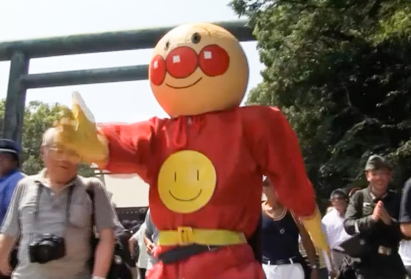終戦記念日の靖国神社に行き、「アンパンマン」の格好をして「アンパンマンのマーチ」を流しながら、境内を行進する。「靖国神社」とは、明治以降の日本の戦争/内戦において体制側で戦死した軍人が「英霊」として祀られている場所だ。