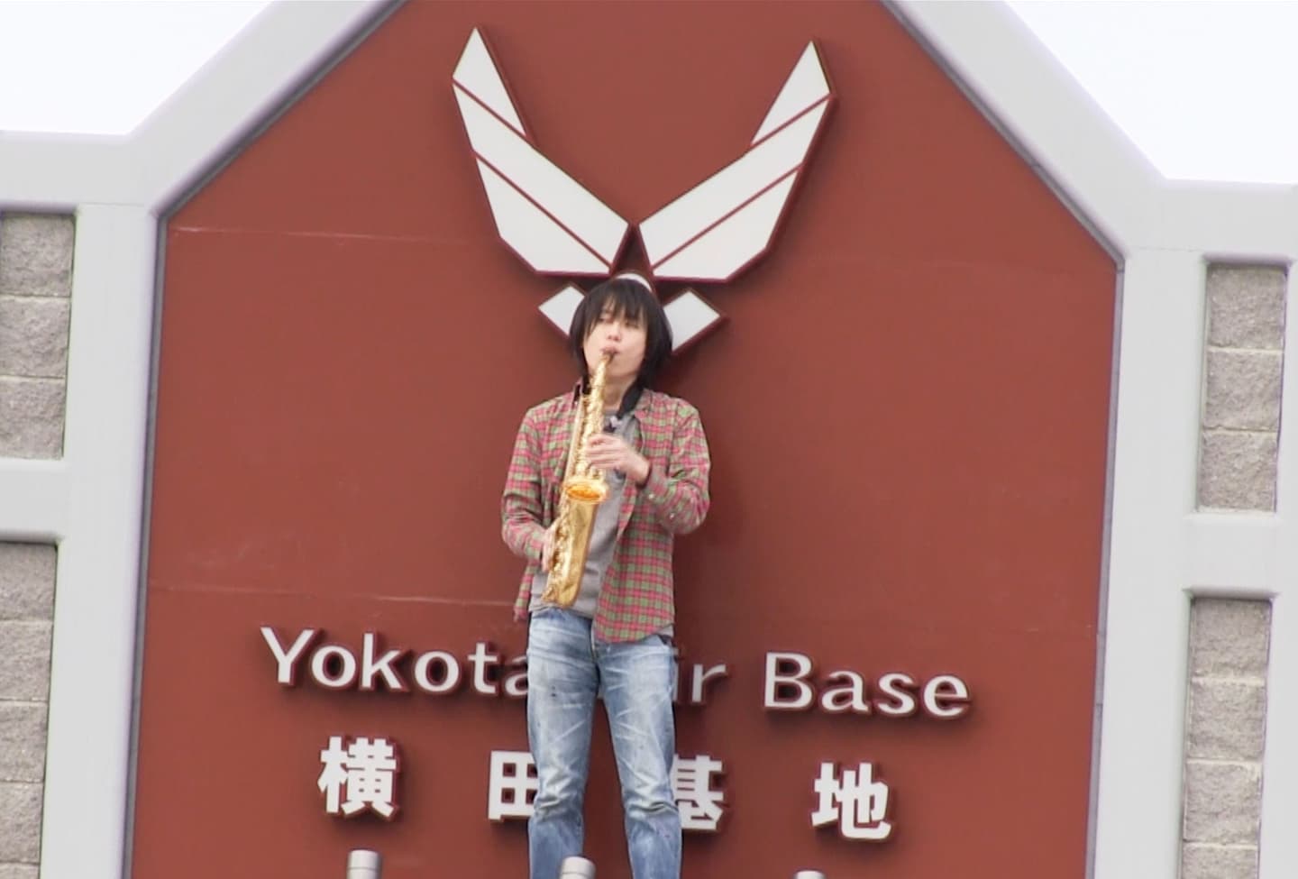 東京福生にある米軍横田基地のゲートによじのぼり、サックスでアメリカ合衆国の第二の国歌ともいわれるマーチ「星条旗よ永遠なれ(Stars and Stripes Forever)」を吹き続ける。そのうち基地内から警告の怒号が飛ぶが、それでも吹き続ける。