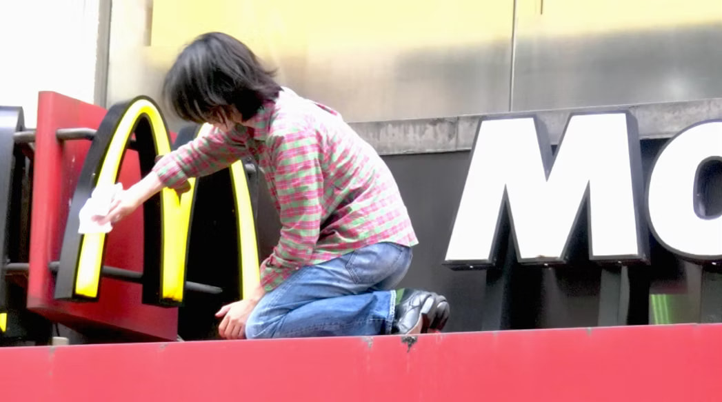 So, with all the gratitude, affection, resentment, and hatred I hold toward McDonald’s, I, uninvitedly, climbed up onto the McDonald’s I visit most often, and cleaned its sign on my own accord.