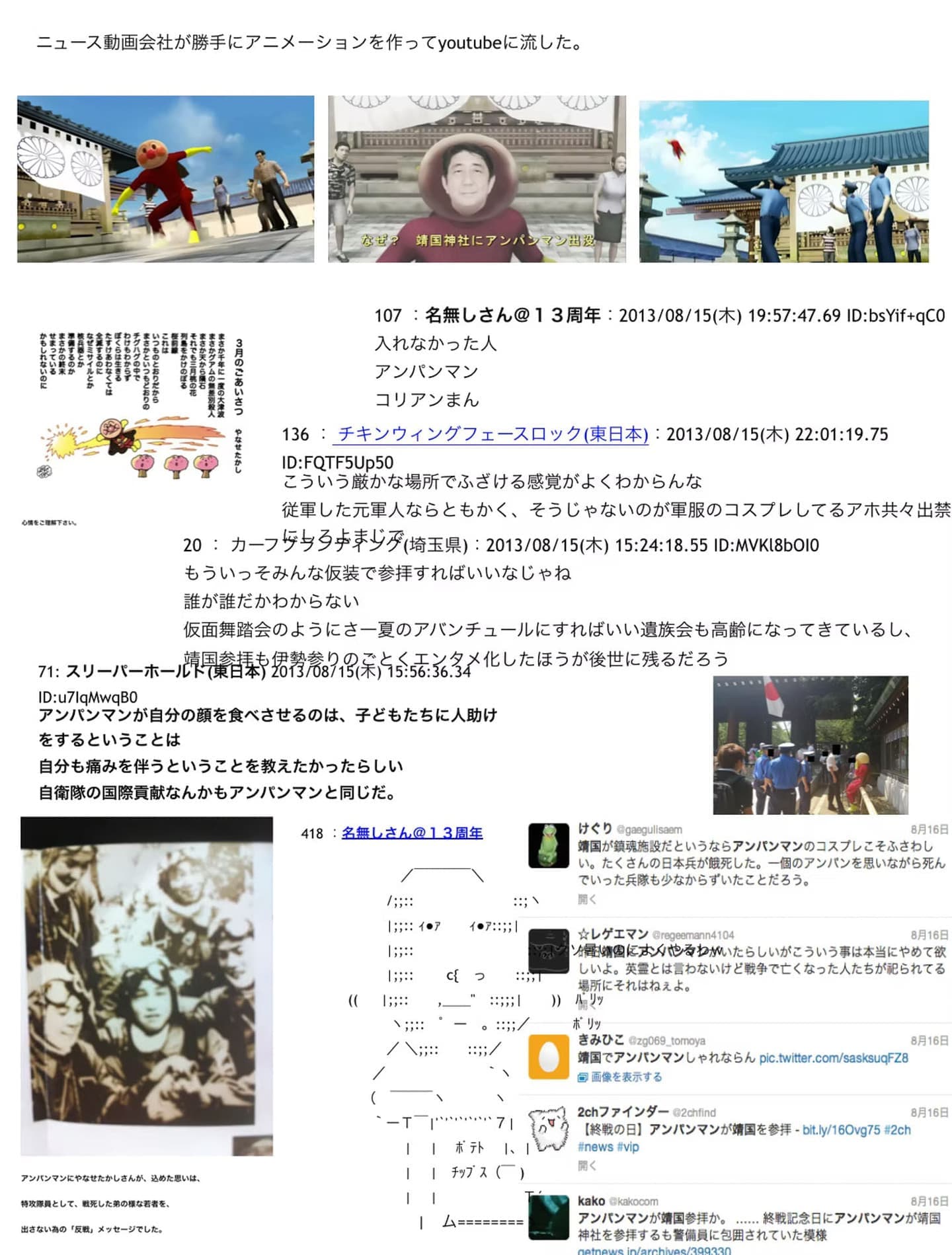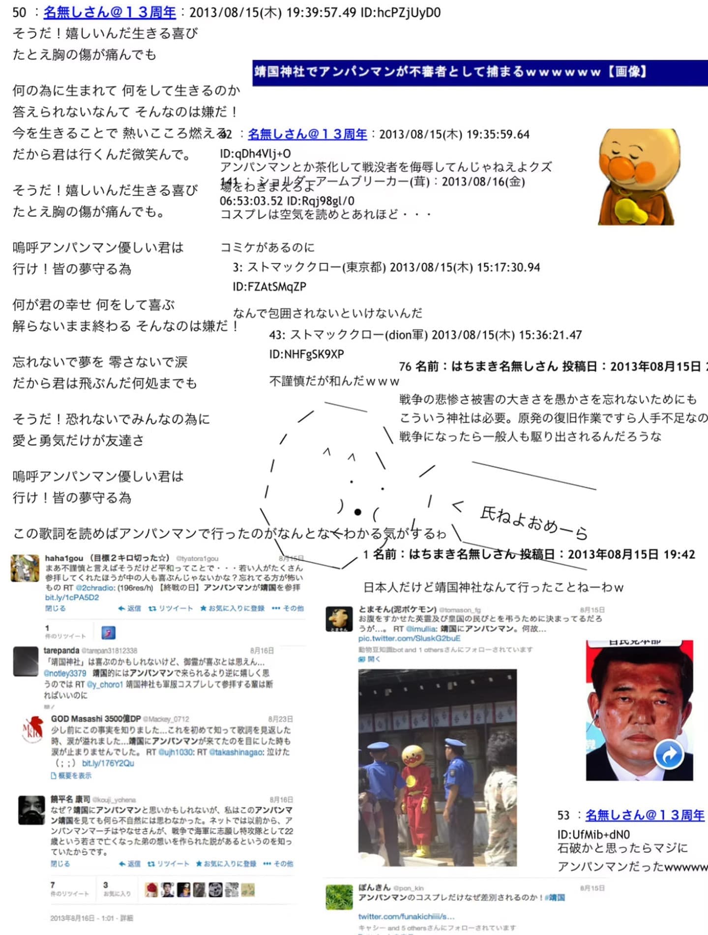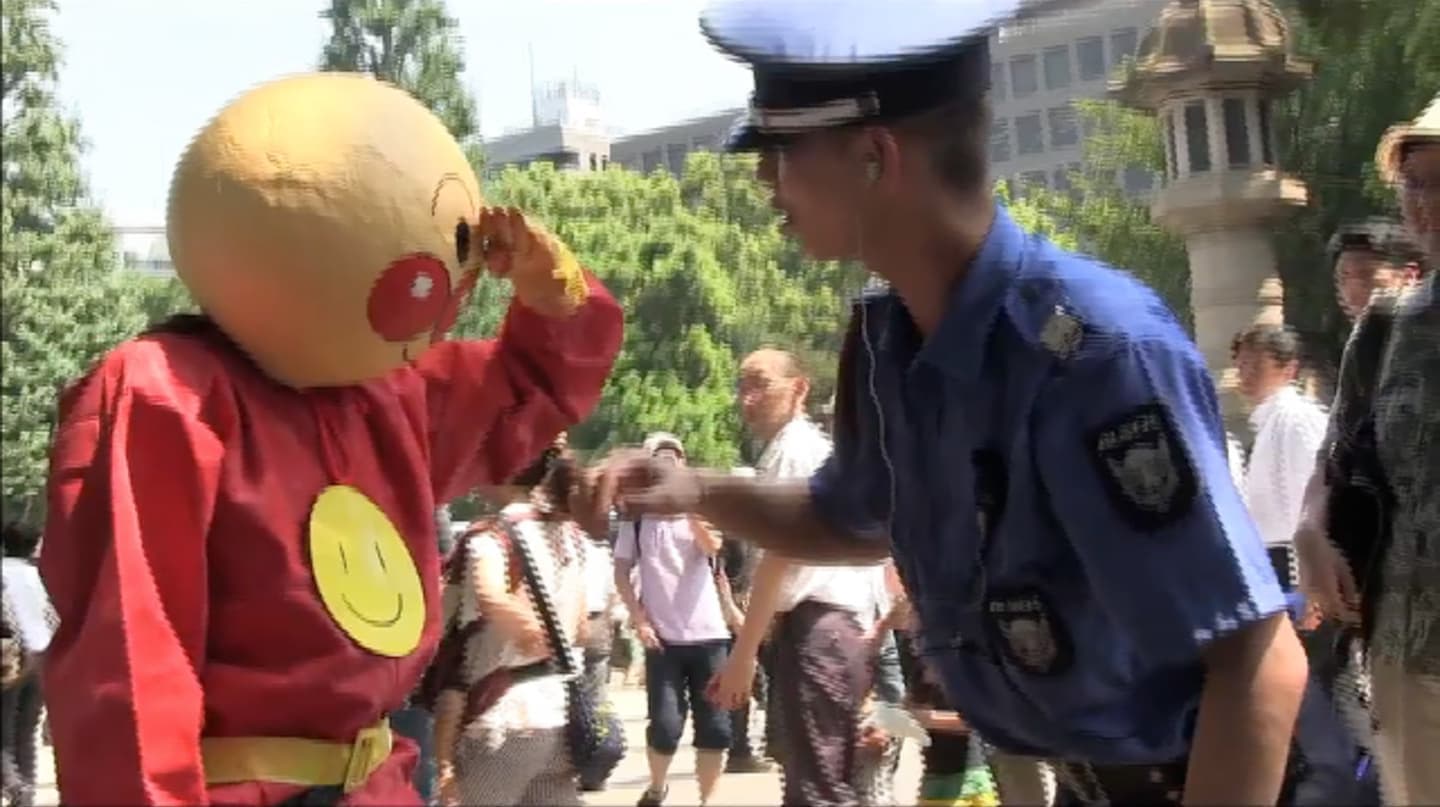 終戦記念日の靖国神社に行き、「アンパンマン」の格好をして「アンパンマンのマーチ」を流しながら境内を行進する。