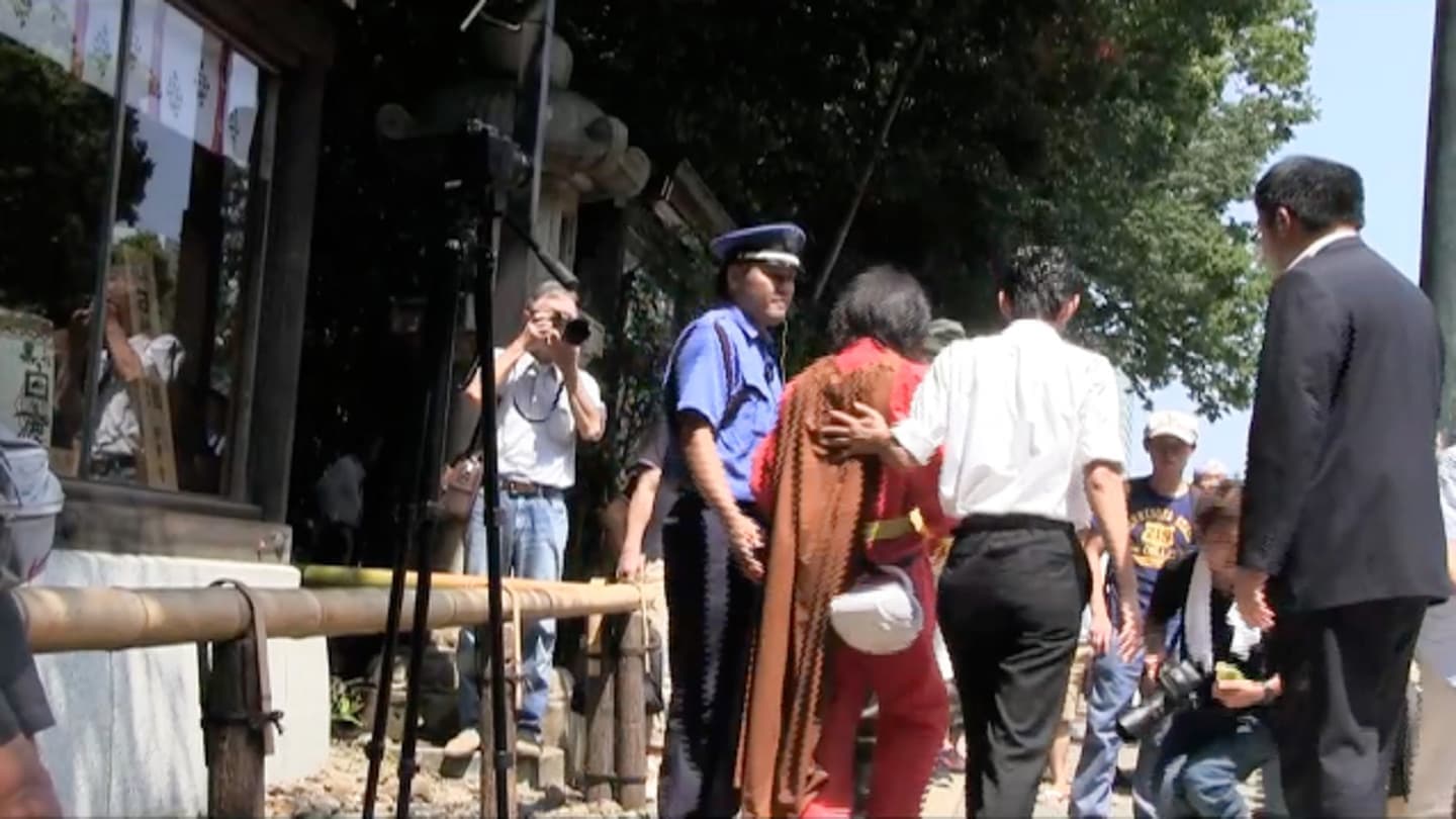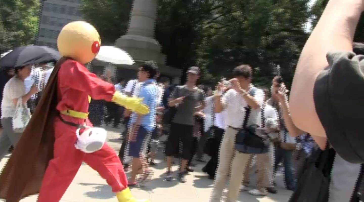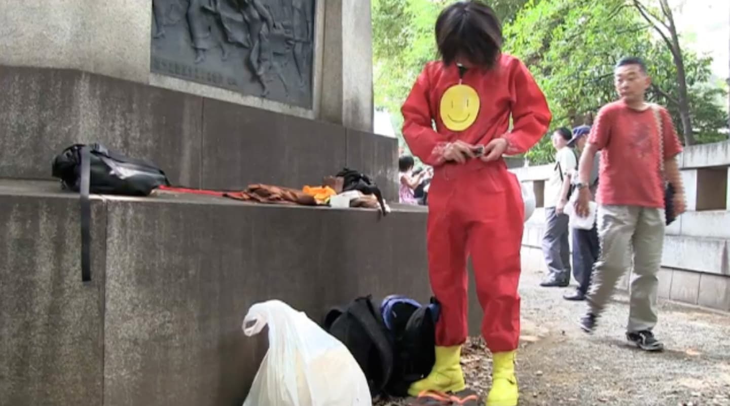 終戦記念日の靖国神社に行き、「アンパンマン」の格好をして「アンパンマンのマーチ」を流しながら境内を行進する。