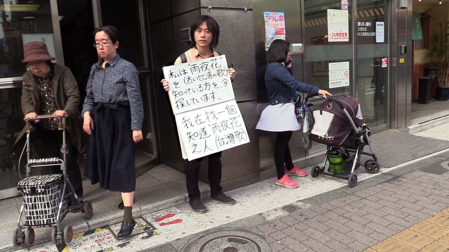 しかし、なかなかお話を聞かせていただける方に出逢えずに途方に暮れていると、友人に「プラカードでも持って街に立ってみたら?」とアドバイスをもらったので、“「雨夜花」を知っている方はいませんか?”という文字を掲げて街角で立ってみた。