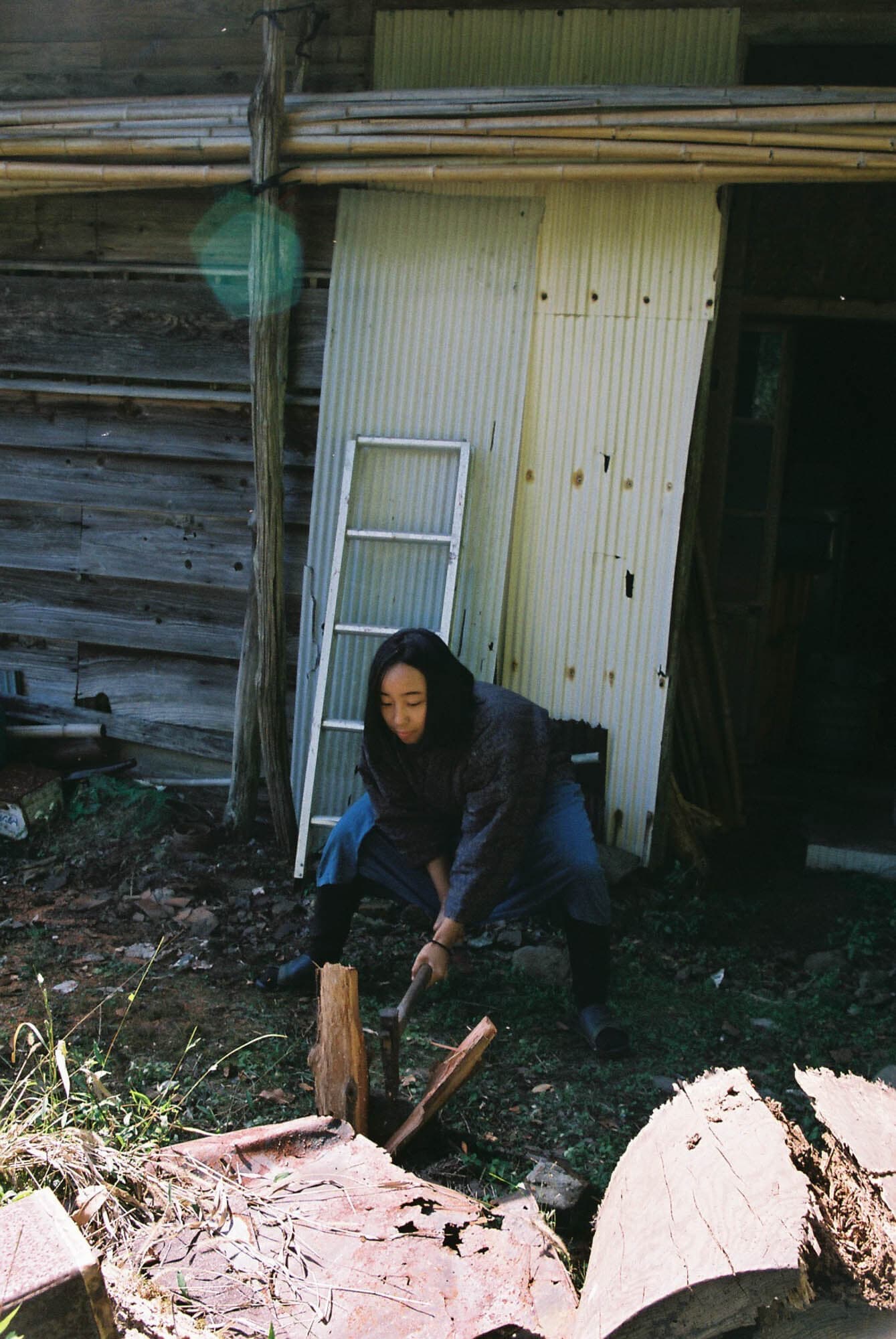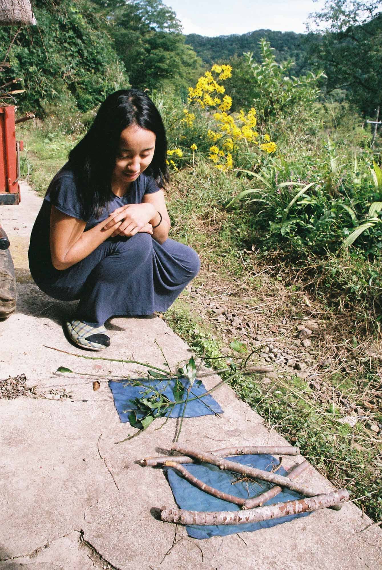 私は、彼女が日々頑張って拾ってはすぐに生活に燃えて消えていく「薪」を、古い写真技法である「サイアノタイプ」(日光で焼き付ける写真)によって、一緒に残すことにした。