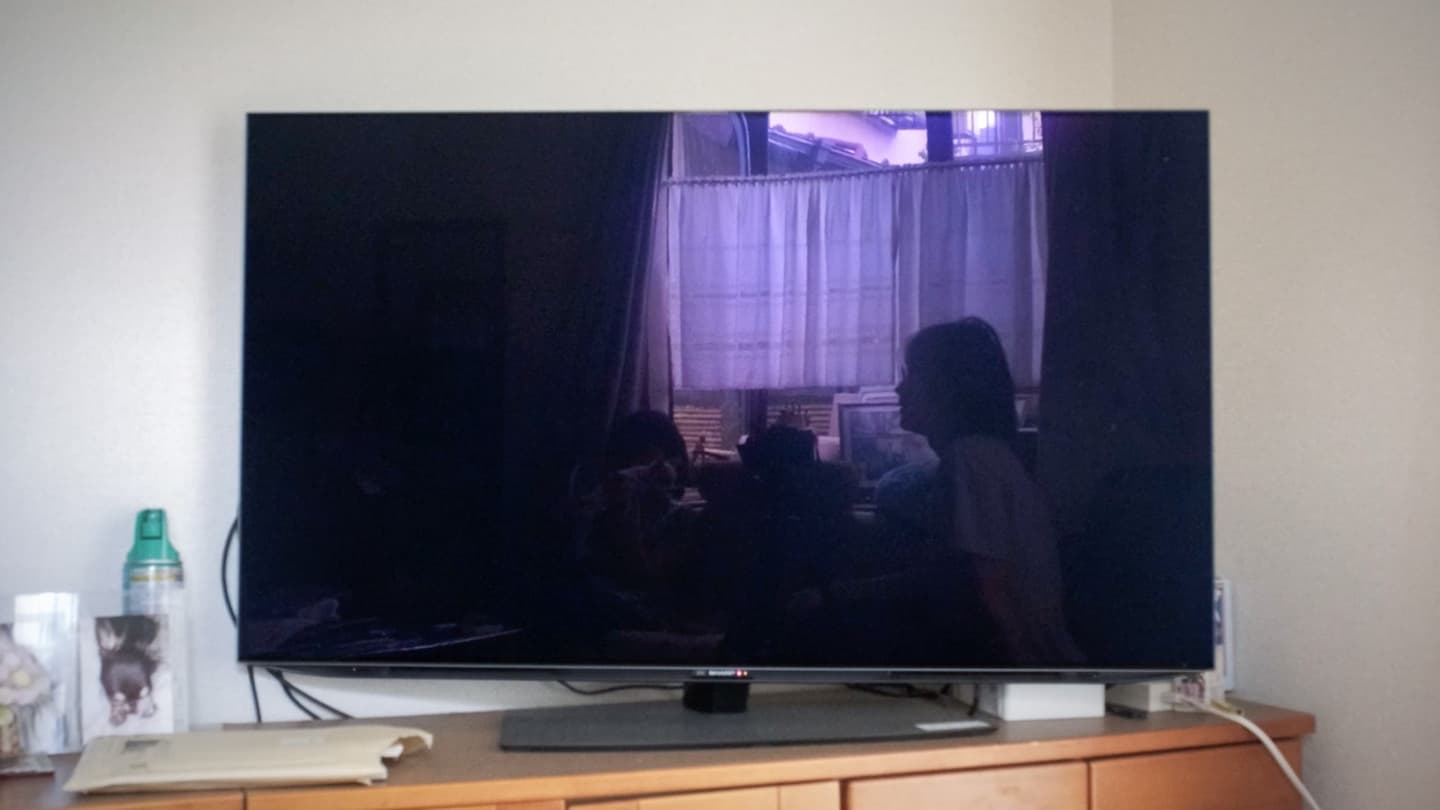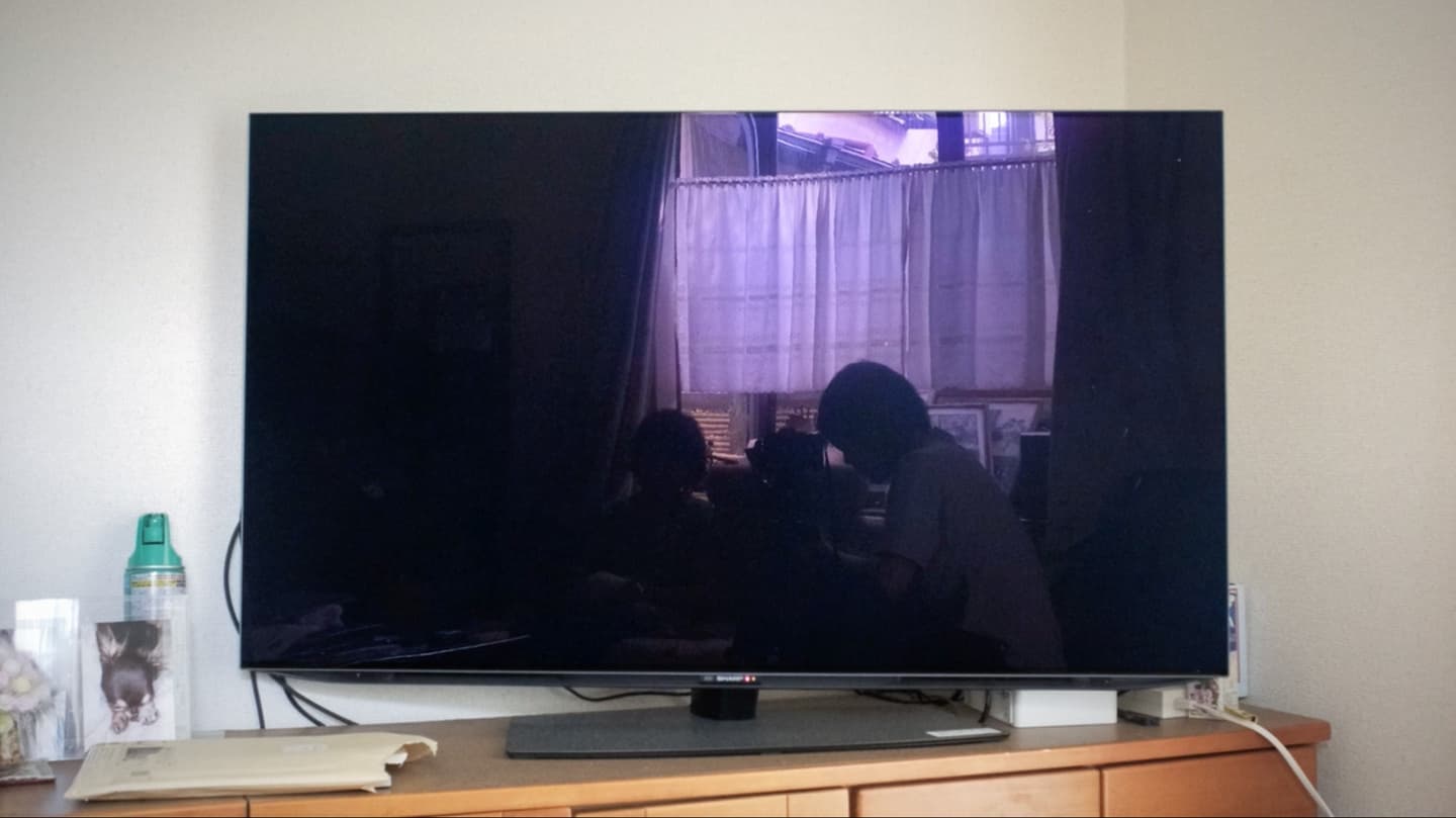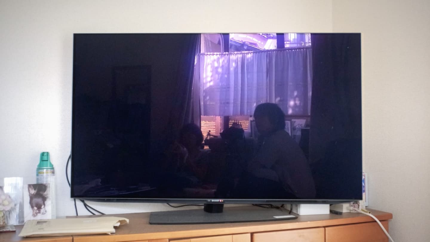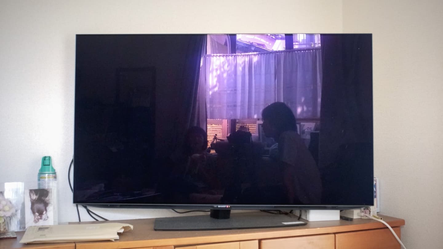 リビングの真ん中にはテレビがある。しかし電源が付いていないため、黒い画面に私たちが反射して見える。