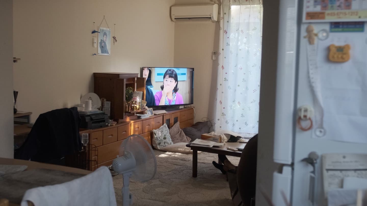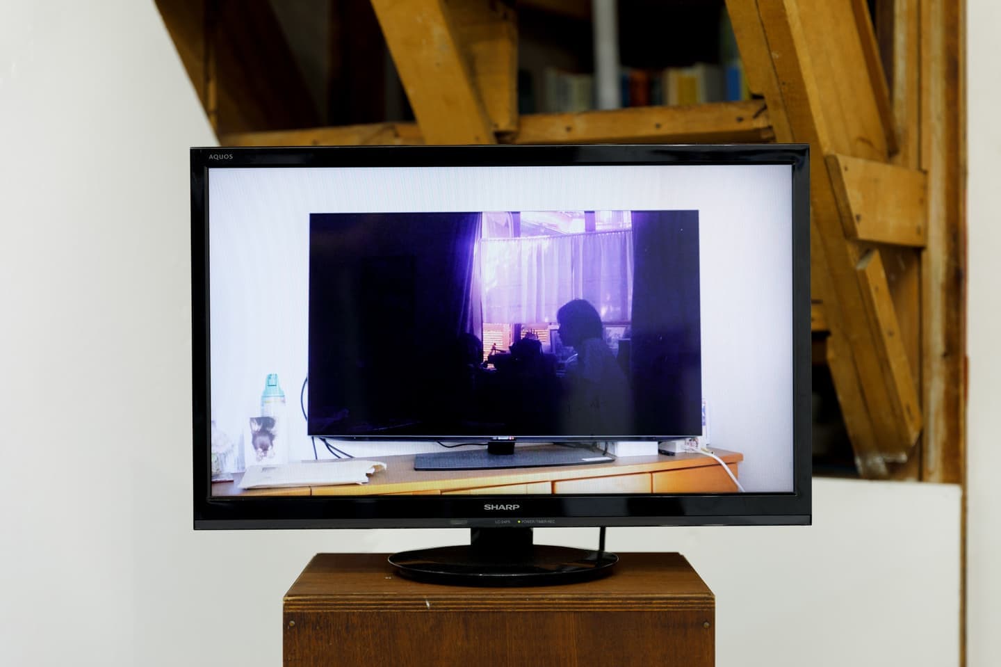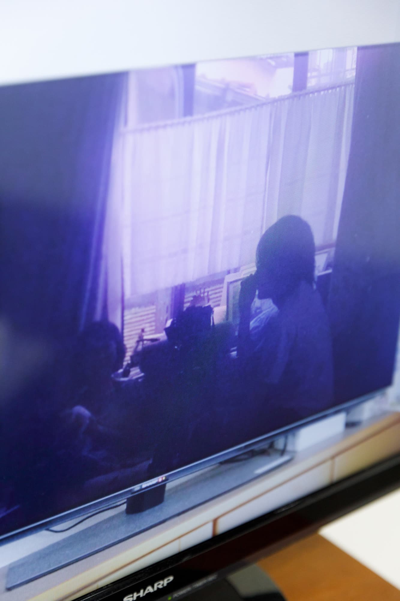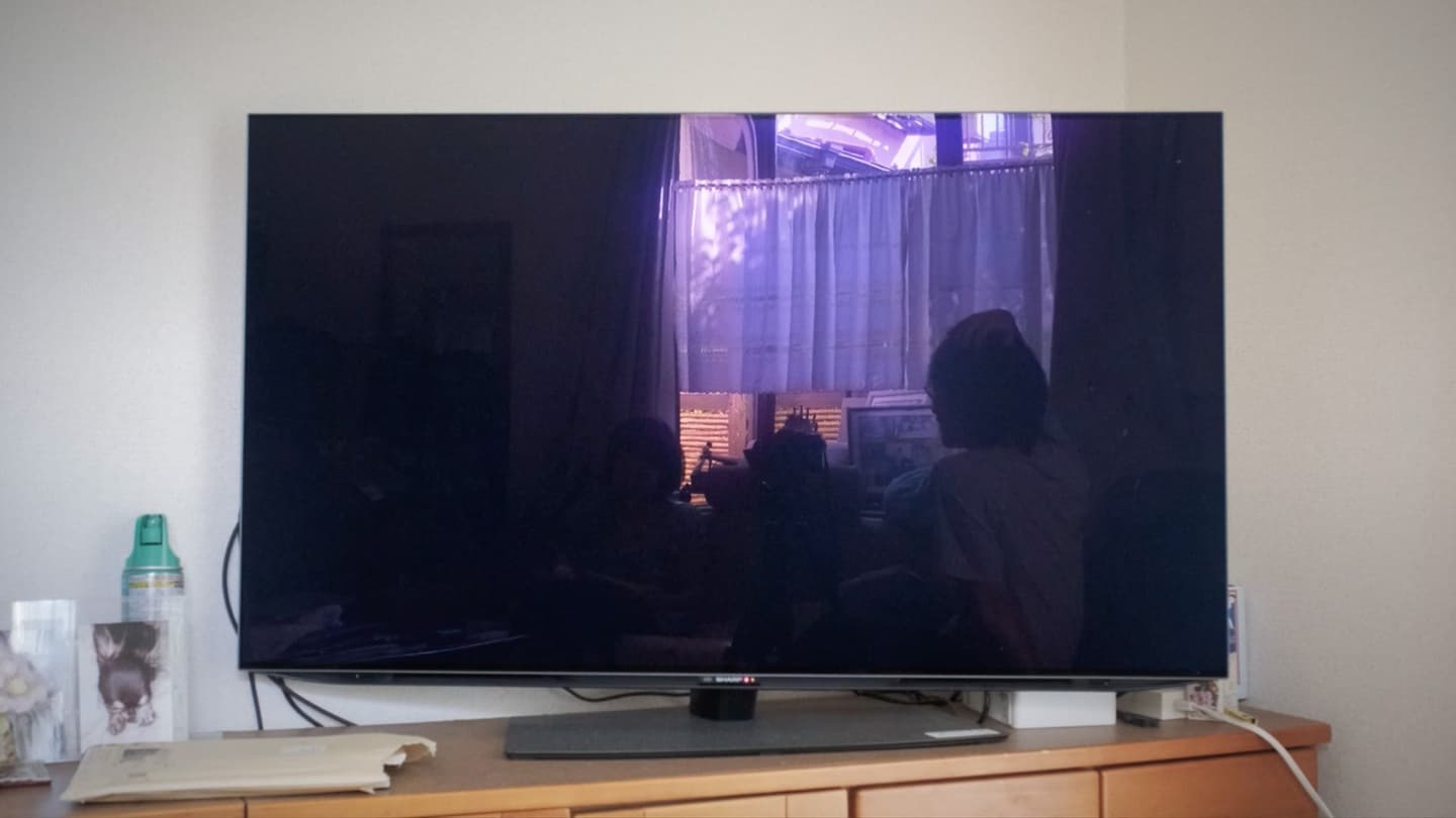 リビングの真ん中にはテレビがある。しかし電源が付いていないため、黒い画面に私たちが反射して見える。